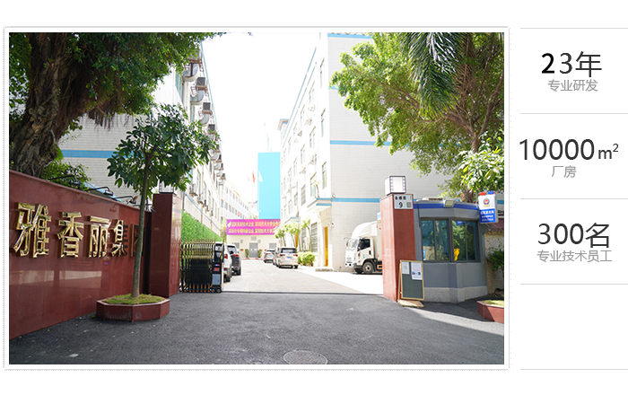 占地面積一萬余平方米,專業技術員工300余人,雅香麗憑借著在行業內的專業化、精細化、特色化、新穎化、可持續化,榮獲國家"高新技術企業"、"深圳市專精特新中小企業"等重量級認證。